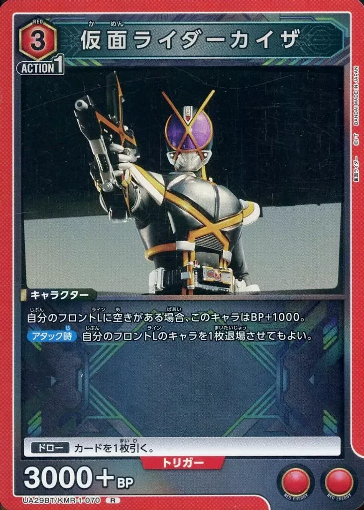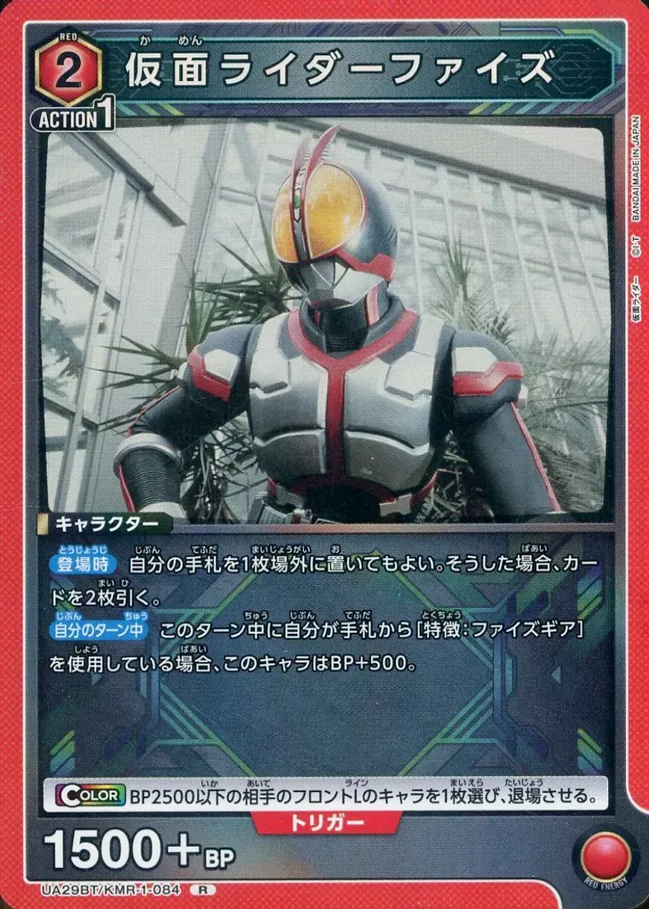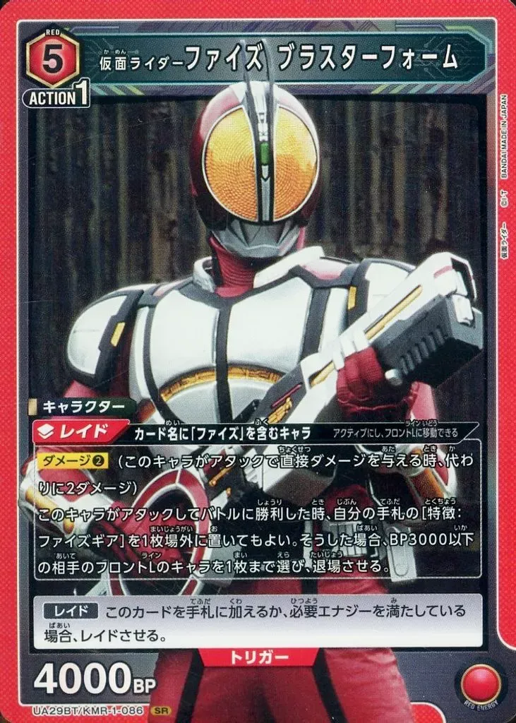 なかでも〈仮面ライダーファイズ ブラスターフォーム〉(KMR-1-086)は、ダメージ2を持っていながら、バトルで勝利した際に、手札の[特徴:ファイズギア]を捨てることで、相手のBP3000以下のキャラを退場させられる強力な効果を持っており、相手に理不尽な2択を仕掛けることができる。