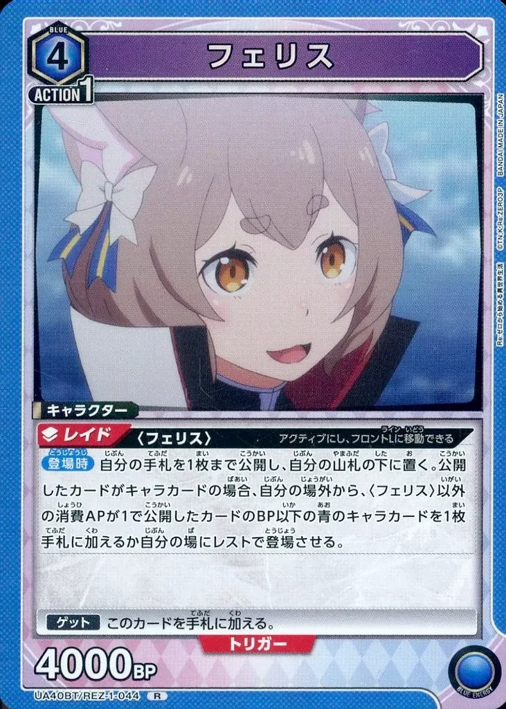 〈フェリス〉のレイド時効果により、0〈ナツキ・スバル〉を呼び戻したり、BP4000のキャラを場外から展開出来る。