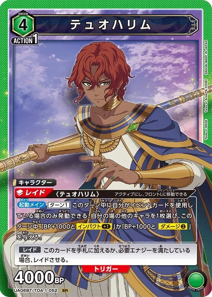 このターン中にイベントを使用していた場合、自分のキャラ1枚にBP+1000インパクト1かダメージ2を付与出来る。